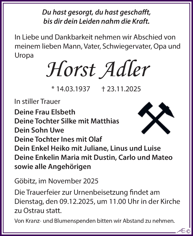 Hier finden Sie alle Traueranzeigen aus der Zeitung, die bisher für Horst Adler erschienen sind. Weitere Traueranzeigen, die in der Zeitung erscheinen, werden hier ebenfalls aufgelistet
