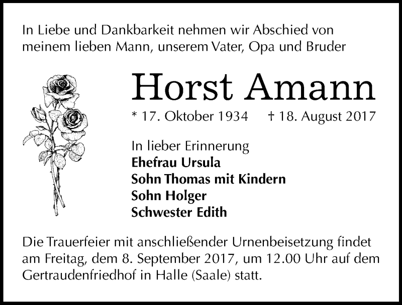 Hier finden Sie alle Traueranzeigen aus der Zeitung, die bisher für Horst Amann erschienen sind. Weitere Traueranzeigen, die in der Zeitung erscheinen, werden hier ebenfalls aufgelistet