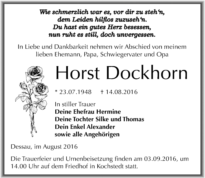 Hier finden Sie alle Traueranzeigen aus der Zeitung, die bisher für Horst Dockhorn erschienen sind. Weitere Traueranzeigen, die in der Zeitung erscheinen, werden hier ebenfalls aufgelistet