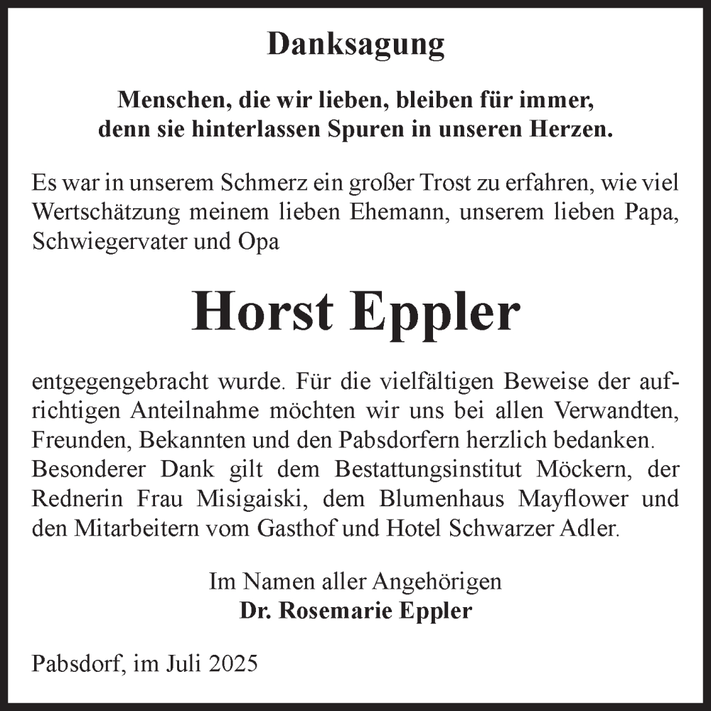 Hier finden Sie alle Traueranzeigen aus der Zeitung, die bisher für Horst Eppler erschienen sind. Weitere Traueranzeigen, die in der Zeitung erscheinen, werden hier ebenfalls aufgelistet