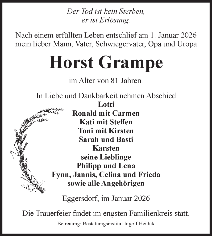 Hier finden Sie alle Traueranzeigen aus der Zeitung, die bisher für Horst Grampe erschienen sind. Weitere Traueranzeigen, die in der Zeitung erscheinen, werden hier ebenfalls aufgelistet