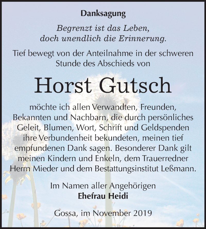 Hier finden Sie alle Traueranzeigen aus der Zeitung, die bisher für Horst Gutsch erschienen sind. Weitere Traueranzeigen, die in der Zeitung erscheinen, werden hier ebenfalls aufgelistet