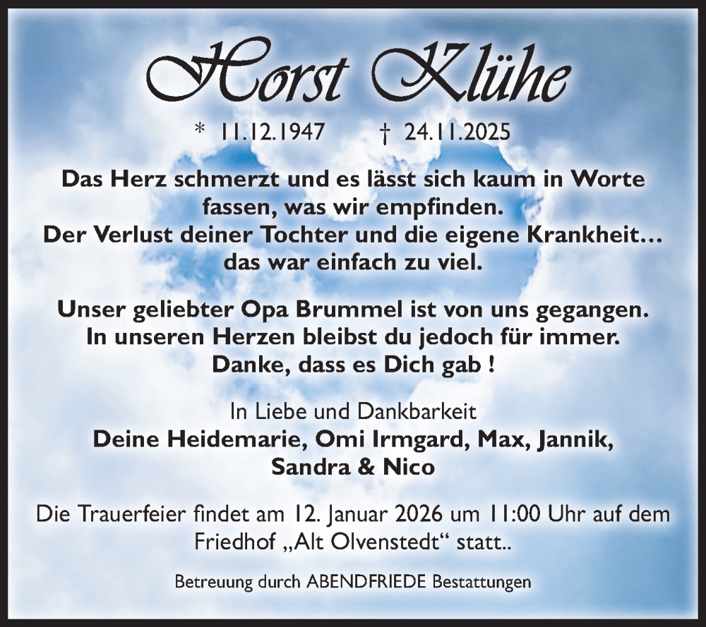 Hier finden Sie alle Traueranzeigen aus der Zeitung, die bisher für Horst Klühe erschienen sind. Weitere Traueranzeigen, die in der Zeitung erscheinen, werden hier ebenfalls aufgelistet