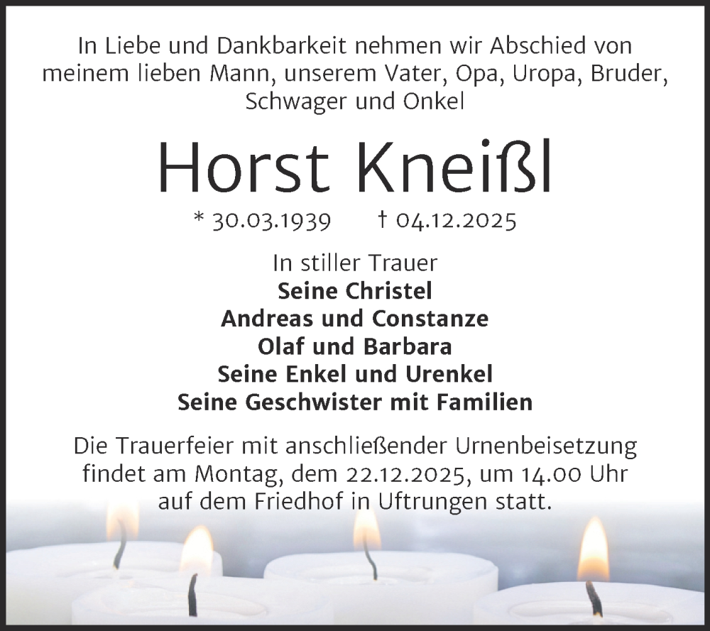 Hier finden Sie alle Traueranzeigen aus der Zeitung, die bisher für Horst Kneißl erschienen sind. Weitere Traueranzeigen, die in der Zeitung erscheinen, werden hier ebenfalls aufgelistet