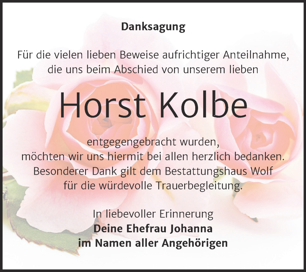 Hier finden Sie alle Traueranzeigen aus der Zeitung, die bisher für Horst Kolbe erschienen sind. Weitere Traueranzeigen, die in der Zeitung erscheinen, werden hier ebenfalls aufgelistet