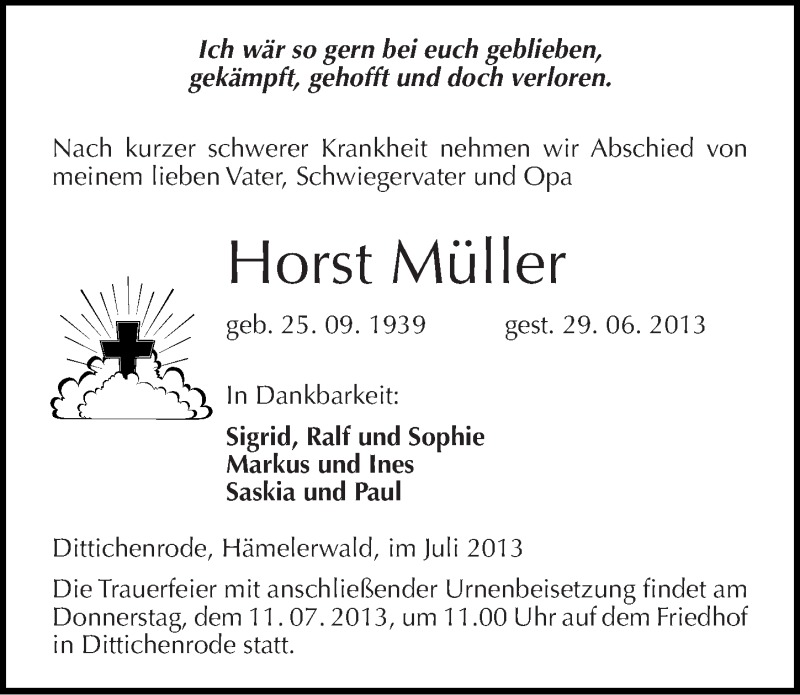 Hier finden Sie alle Traueranzeigen aus der Zeitung, die bisher für Horst Müller erschienen sind. Weitere Traueranzeigen, die in der Zeitung erscheinen, werden hier ebenfalls aufgelistet
