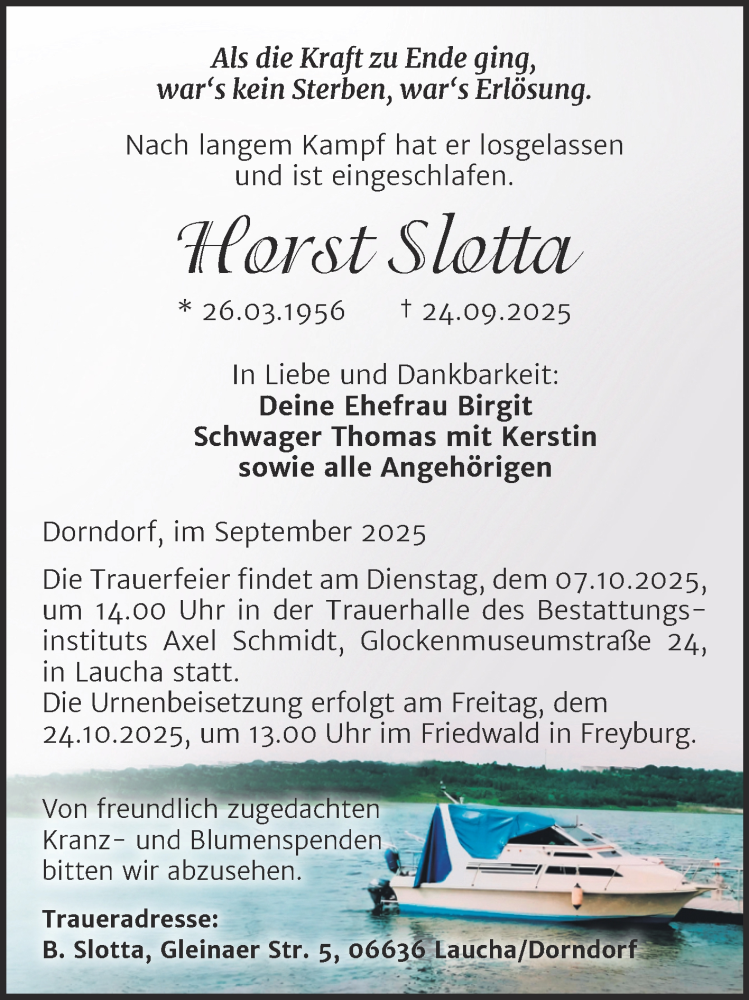 Hier finden Sie alle Traueranzeigen aus der Zeitung, die bisher für Horst Slotta erschienen sind. Weitere Traueranzeigen, die in der Zeitung erscheinen, werden hier ebenfalls aufgelistet