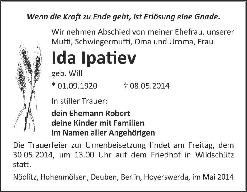 Hier finden Sie alle Traueranzeigen aus der Zeitung, die bisher für Ida Ipatiev erschienen sind. Weitere Traueranzeigen, die in der Zeitung erscheinen, werden hier ebenfalls aufgelistet