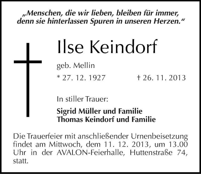 Hier finden Sie alle Traueranzeigen aus der Zeitung, die bisher für Ilse Keindorf erschienen sind. Weitere Traueranzeigen, die in der Zeitung erscheinen, werden hier ebenfalls aufgelistet