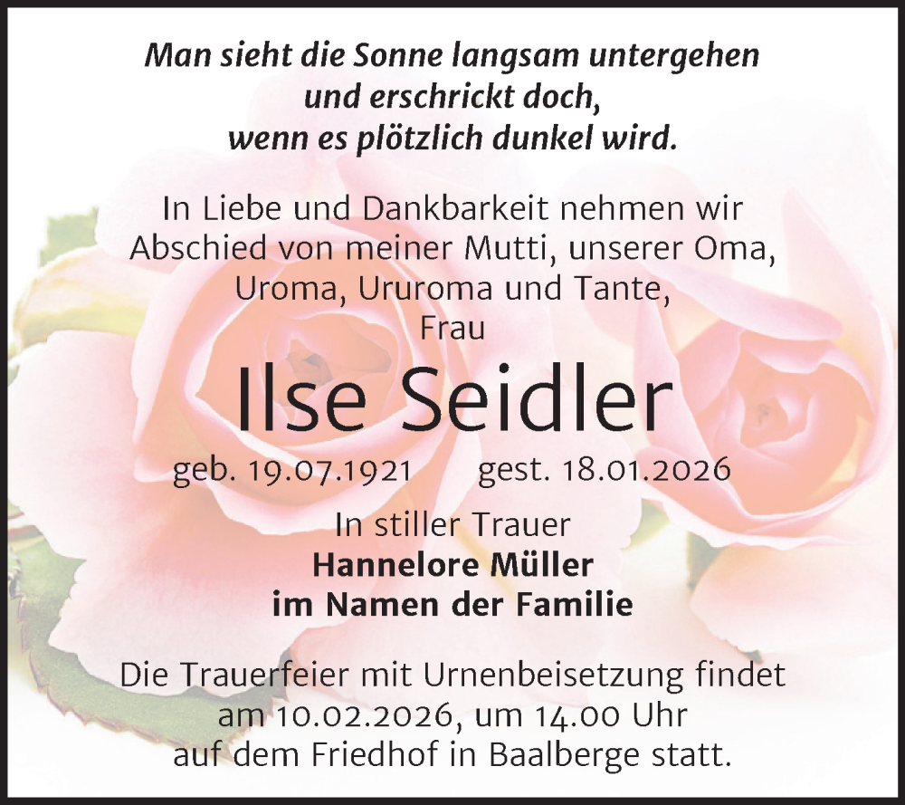 Hier finden Sie alle Traueranzeigen aus der Zeitung, die bisher für Ilse Seidler erschienen sind. Weitere Traueranzeigen, die in der Zeitung erscheinen, werden hier ebenfalls aufgelistet