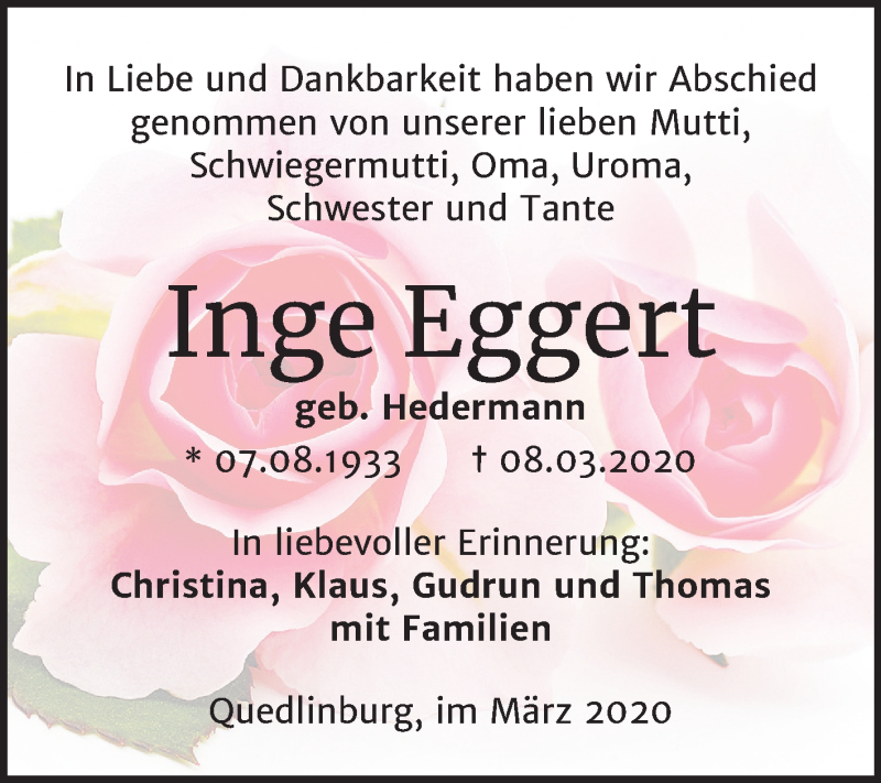 Hier finden Sie alle Traueranzeigen aus der Zeitung, die bisher für Inge Eggert erschienen sind. Weitere Traueranzeigen, die in der Zeitung erscheinen, werden hier ebenfalls aufgelistet