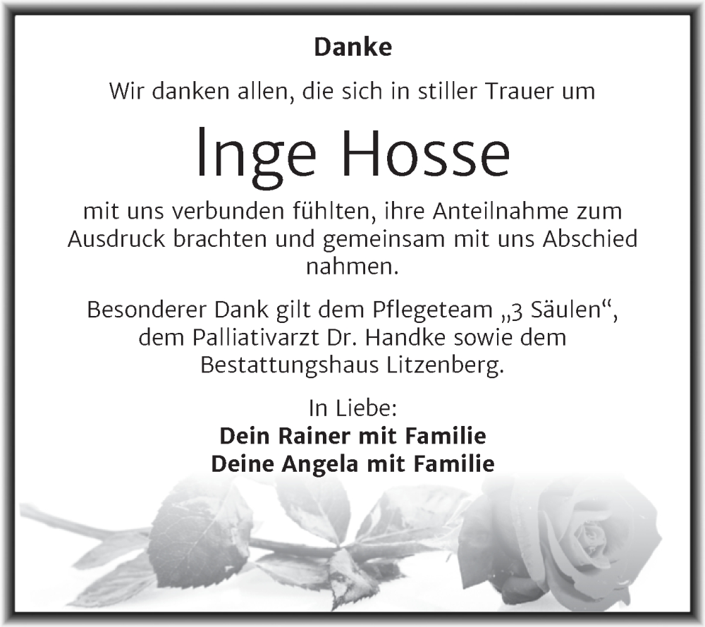 Hier finden Sie alle Traueranzeigen aus der Zeitung, die bisher für Inge Hosse erschienen sind. Weitere Traueranzeigen, die in der Zeitung erscheinen, werden hier ebenfalls aufgelistet