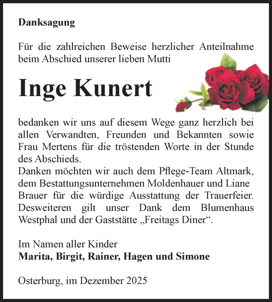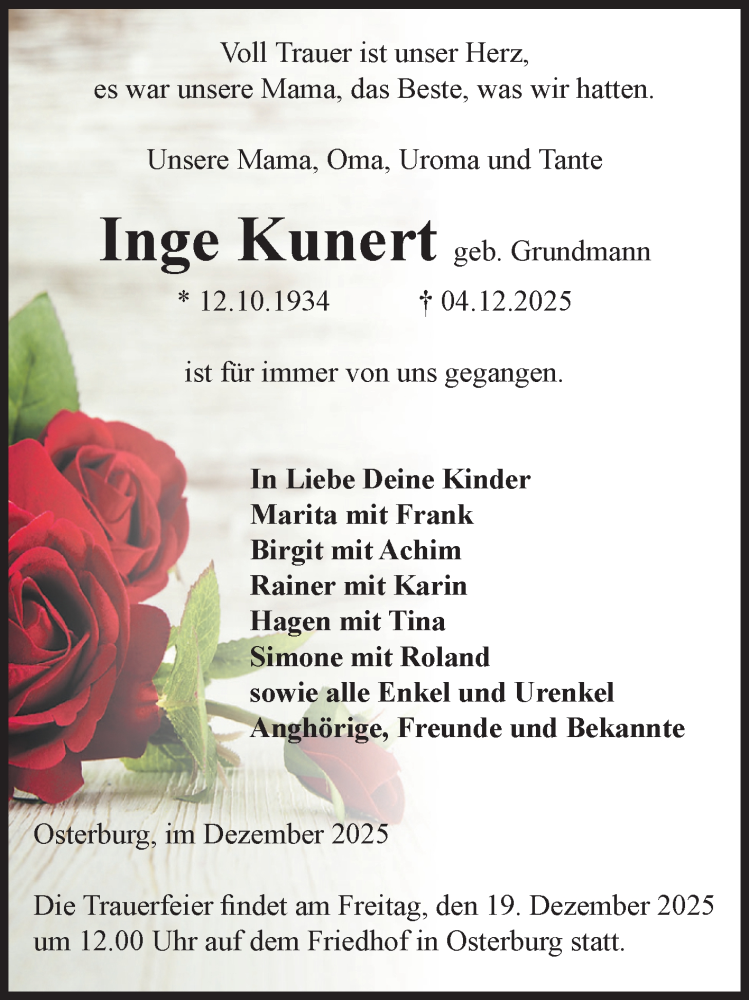 Hier finden Sie alle Traueranzeigen aus der Zeitung, die bisher für Inge Kunert erschienen sind. Weitere Traueranzeigen, die in der Zeitung erscheinen, werden hier ebenfalls aufgelistet