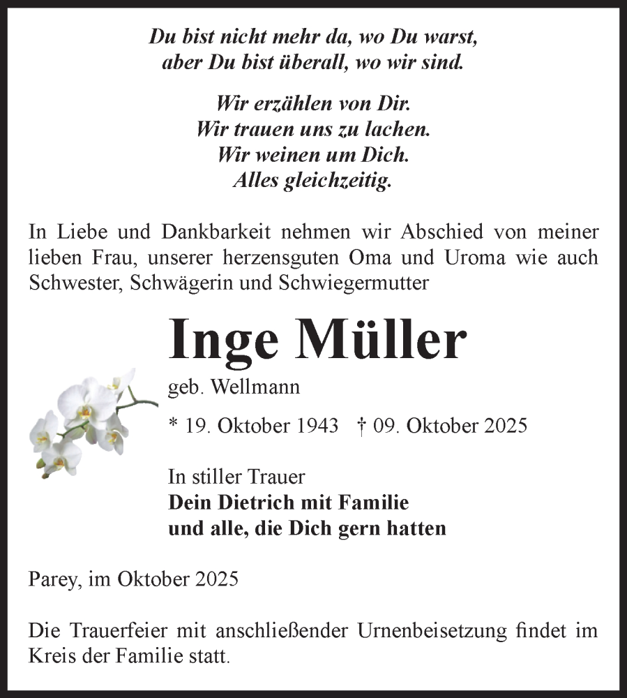 Hier finden Sie alle Traueranzeigen aus der Zeitung, die bisher für Inge Müller erschienen sind. Weitere Traueranzeigen, die in der Zeitung erscheinen, werden hier ebenfalls aufgelistet