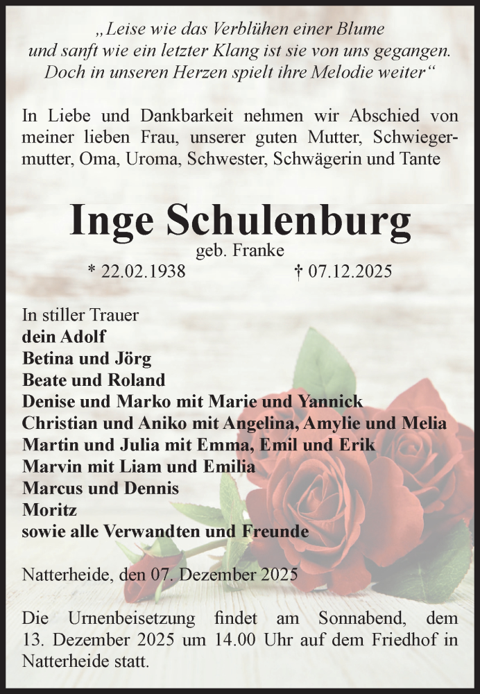 Hier finden Sie alle Traueranzeigen aus der Zeitung, die bisher für Inge Schulenburg erschienen sind. Weitere Traueranzeigen, die in der Zeitung erscheinen, werden hier ebenfalls aufgelistet