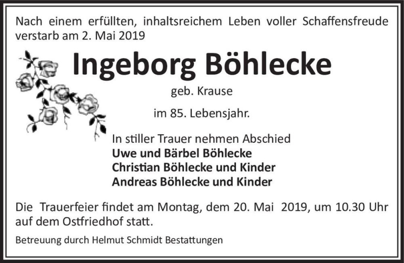 Hier finden Sie alle Traueranzeigen aus der Zeitung, die bisher für Ingeborg Böhlecke (geb. Krause) erschienen sind. Weitere Traueranzeigen, die in der Zeitung erscheinen, werden hier ebenfalls aufgelistet