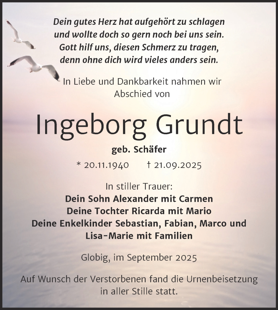 Hier finden Sie alle Traueranzeigen aus der Zeitung, die bisher für Ingeborg Grundt erschienen sind. Weitere Traueranzeigen, die in der Zeitung erscheinen, werden hier ebenfalls aufgelistet