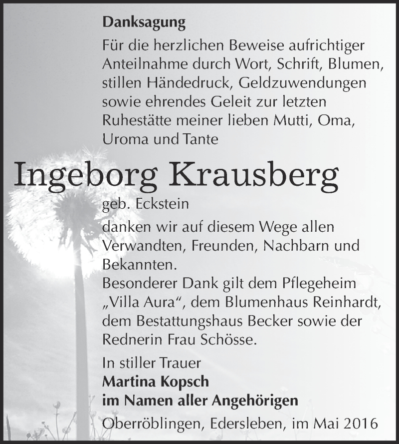 Hier finden Sie alle Traueranzeigen aus der Zeitung, die bisher für Ingeborg Krausberg erschienen sind. Weitere Traueranzeigen, die in der Zeitung erscheinen, werden hier ebenfalls aufgelistet