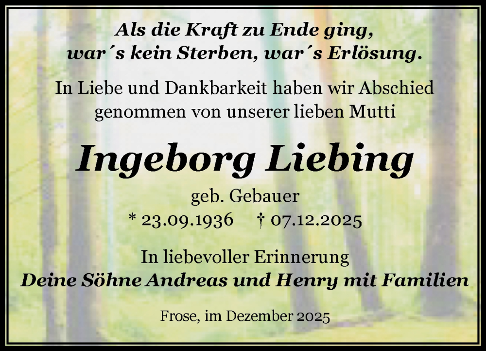 Hier finden Sie alle Traueranzeigen aus der Zeitung, die bisher für Ingeborg Liebing erschienen sind. Weitere Traueranzeigen, die in der Zeitung erscheinen, werden hier ebenfalls aufgelistet