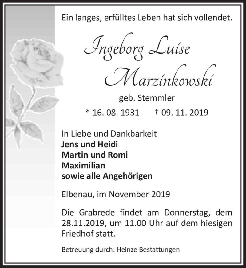 Hier finden Sie alle Traueranzeigen aus der Zeitung, die bisher für Ingeborg Luise Marzinkowski (geb. Stemmler) erschienen sind. Weitere Traueranzeigen, die in der Zeitung erscheinen, werden hier ebenfalls aufgelistet