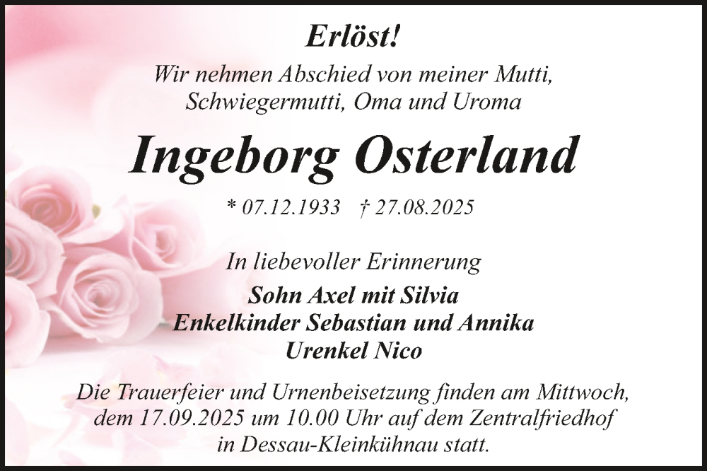 Hier finden Sie alle Traueranzeigen aus der Zeitung, die bisher für Ingeborg Osterland erschienen sind. Weitere Traueranzeigen, die in der Zeitung erscheinen, werden hier ebenfalls aufgelistet