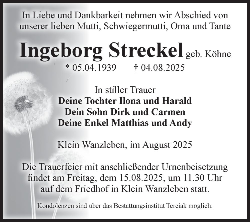 Hier finden Sie alle Traueranzeigen aus der Zeitung, die bisher für Ingeborg Streckel erschienen sind. Weitere Traueranzeigen, die in der Zeitung erscheinen, werden hier ebenfalls aufgelistet