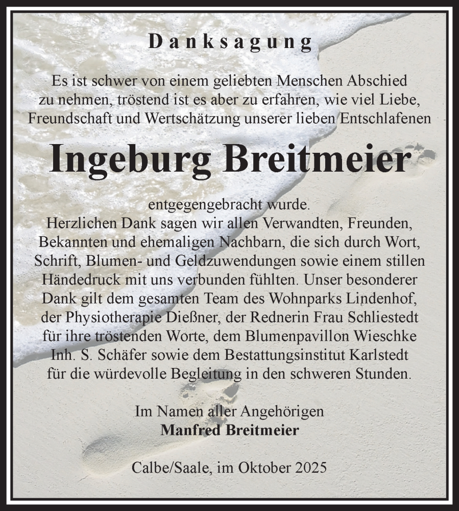 Hier finden Sie alle Traueranzeigen aus der Zeitung, die bisher für Ingeburg Breitmeier erschienen sind. Weitere Traueranzeigen, die in der Zeitung erscheinen, werden hier ebenfalls aufgelistet