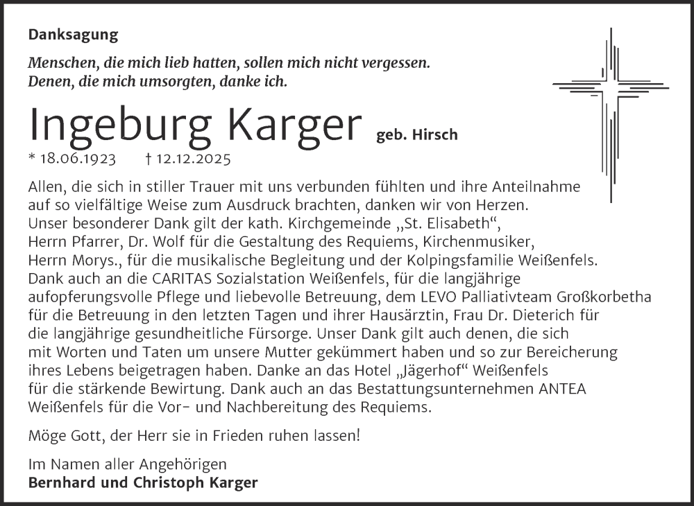 Hier finden Sie alle Traueranzeigen aus der Zeitung, die bisher für Ingeburg Karger erschienen sind. Weitere Traueranzeigen, die in der Zeitung erscheinen, werden hier ebenfalls aufgelistet