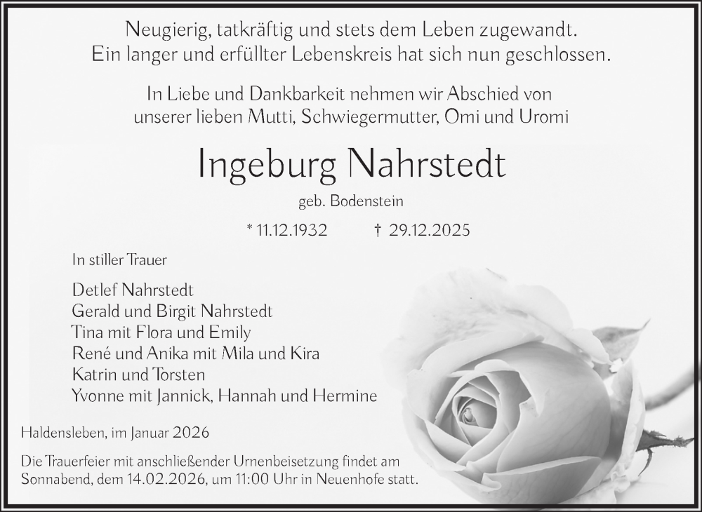 Hier finden Sie alle Traueranzeigen aus der Zeitung, die bisher für Ingeburg Nahrstedt erschienen sind. Weitere Traueranzeigen, die in der Zeitung erscheinen, werden hier ebenfalls aufgelistet