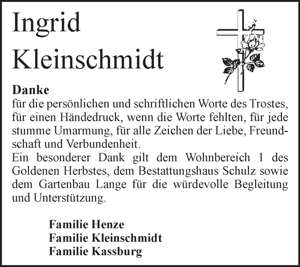 Hier finden Sie alle Traueranzeigen aus der Zeitung, die bisher für Ingrid Kleinschmidt erschienen sind. Weitere Traueranzeigen, die in der Zeitung erscheinen, werden hier ebenfalls aufgelistet