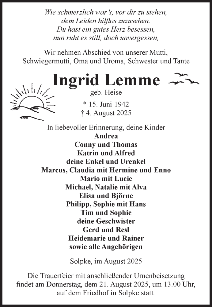 Hier finden Sie alle Traueranzeigen aus der Zeitung, die bisher für Ingrid Lemme erschienen sind. Weitere Traueranzeigen, die in der Zeitung erscheinen, werden hier ebenfalls aufgelistet