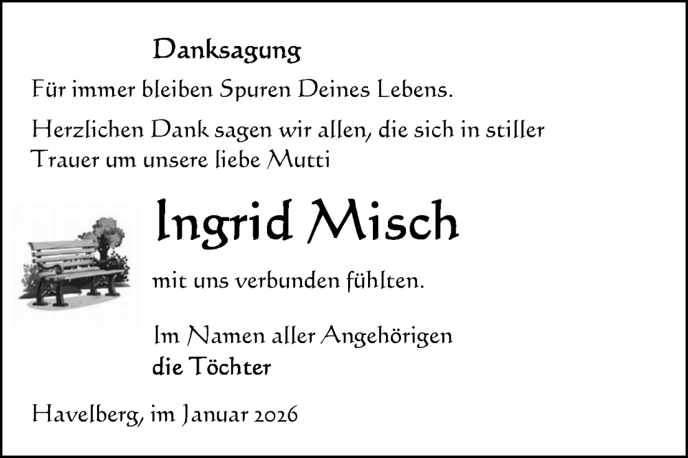Hier finden Sie alle Traueranzeigen aus der Zeitung, die bisher für Ingrid Misch erschienen sind. Weitere Traueranzeigen, die in der Zeitung erscheinen, werden hier ebenfalls aufgelistet
