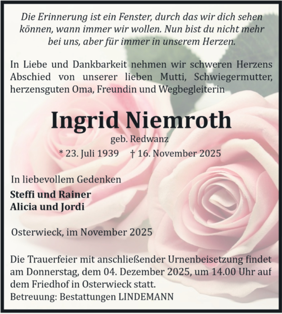 Hier finden Sie alle Traueranzeigen aus der Zeitung, die bisher für Ingrid Niemroth erschienen sind. Weitere Traueranzeigen, die in der Zeitung erscheinen, werden hier ebenfalls aufgelistet