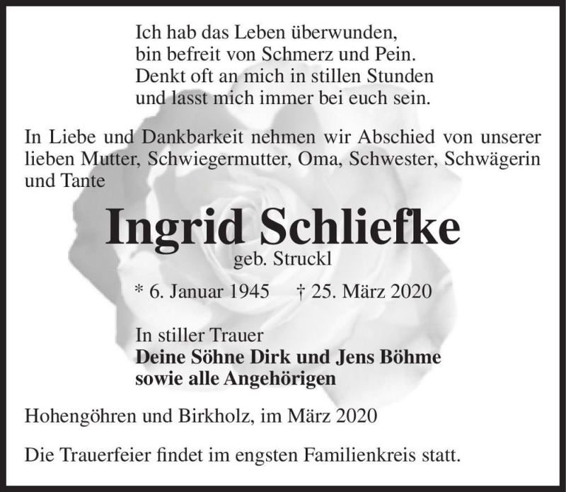 Hier finden Sie alle Traueranzeigen aus der Zeitung, die bisher für Ingrid Schliefke (geb. Struckl) erschienen sind. Weitere Traueranzeigen, die in der Zeitung erscheinen, werden hier ebenfalls aufgelistet