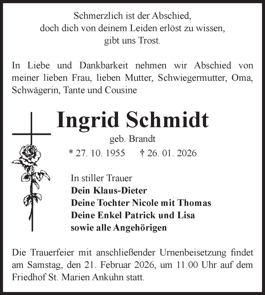 Hier finden Sie alle Traueranzeigen aus der Zeitung, die bisher für Ingrid Schmidt erschienen sind. Weitere Traueranzeigen, die in der Zeitung erscheinen, werden hier ebenfalls aufgelistet