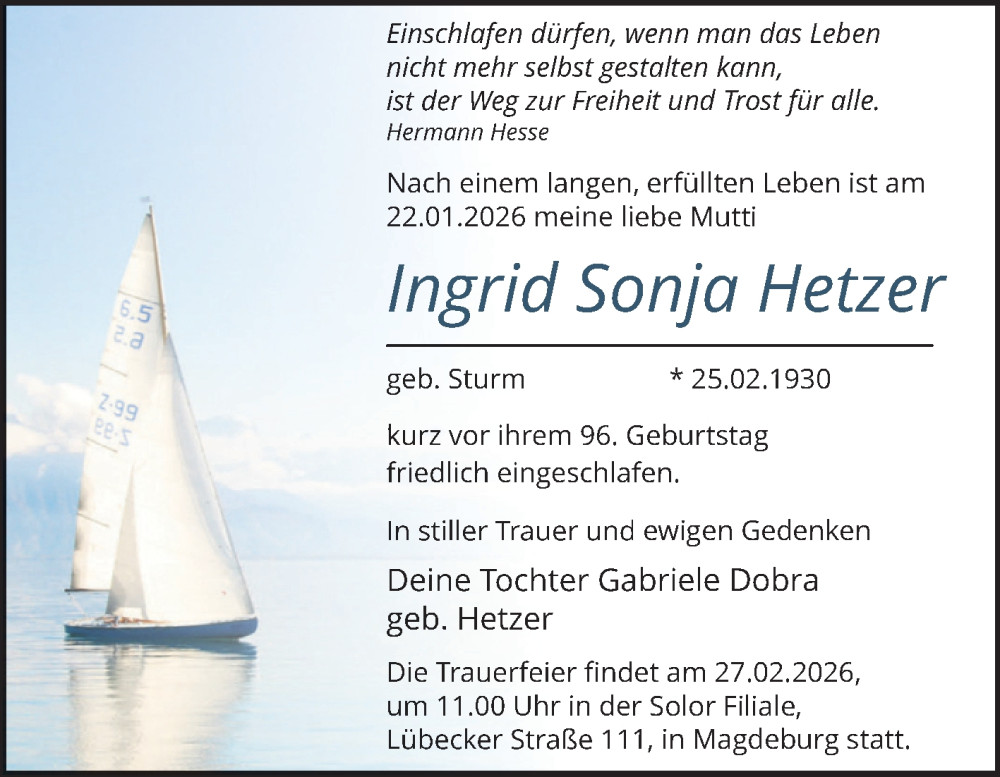 Hier finden Sie alle Traueranzeigen aus der Zeitung, die bisher für Ingrid Sonja Hetzer erschienen sind. Weitere Traueranzeigen, die in der Zeitung erscheinen, werden hier ebenfalls aufgelistet