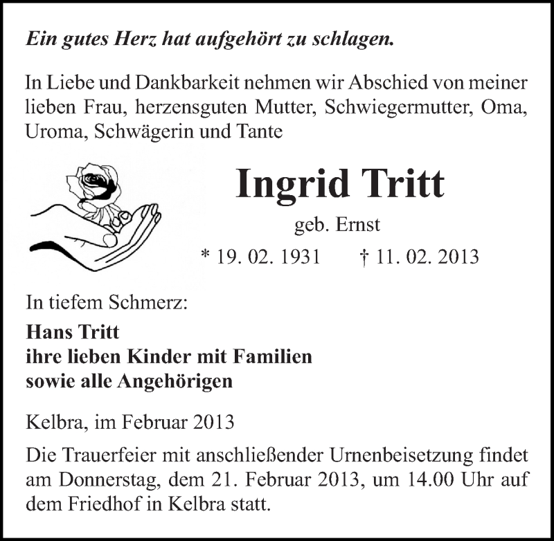 Hier finden Sie alle Traueranzeigen aus der Zeitung, die bisher für Ingrid Tritt erschienen sind. Weitere Traueranzeigen, die in der Zeitung erscheinen, werden hier ebenfalls aufgelistet