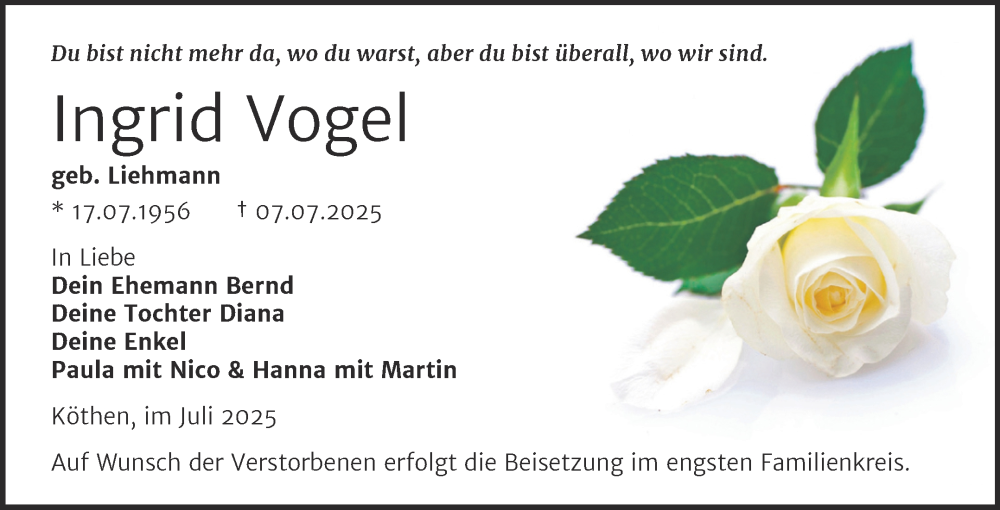 Hier finden Sie alle Traueranzeigen aus der Zeitung, die bisher für Ingrid Vogel erschienen sind. Weitere Traueranzeigen, die in der Zeitung erscheinen, werden hier ebenfalls aufgelistet