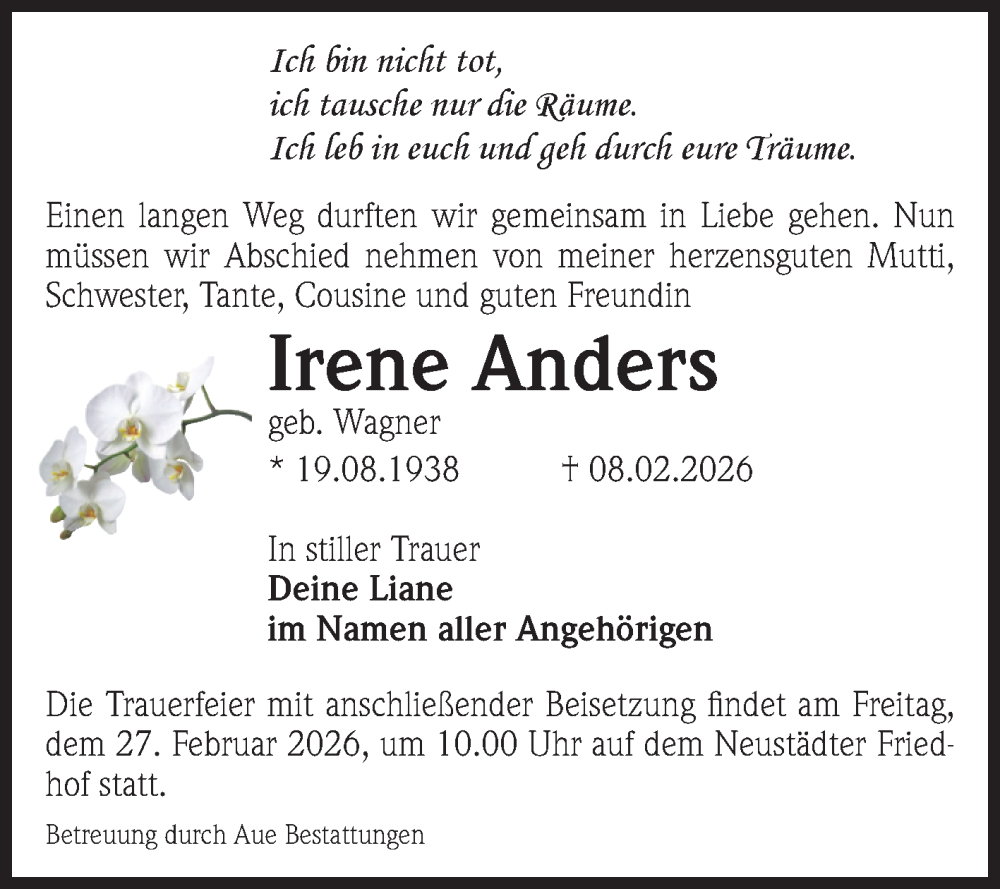 Hier finden Sie alle Traueranzeigen aus der Zeitung, die bisher für Irene Anders erschienen sind. Weitere Traueranzeigen, die in der Zeitung erscheinen, werden hier ebenfalls aufgelistet