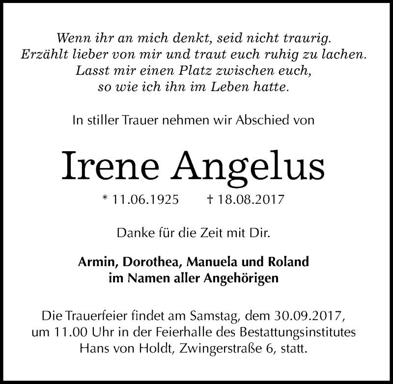 Hier finden Sie alle Traueranzeigen aus der Zeitung, die bisher für Irene Angelus erschienen sind. Weitere Traueranzeigen, die in der Zeitung erscheinen, werden hier ebenfalls aufgelistet