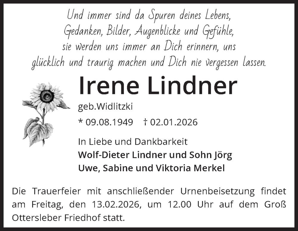 Hier finden Sie alle Traueranzeigen aus der Zeitung, die bisher für Irene Lindner erschienen sind. Weitere Traueranzeigen, die in der Zeitung erscheinen, werden hier ebenfalls aufgelistet