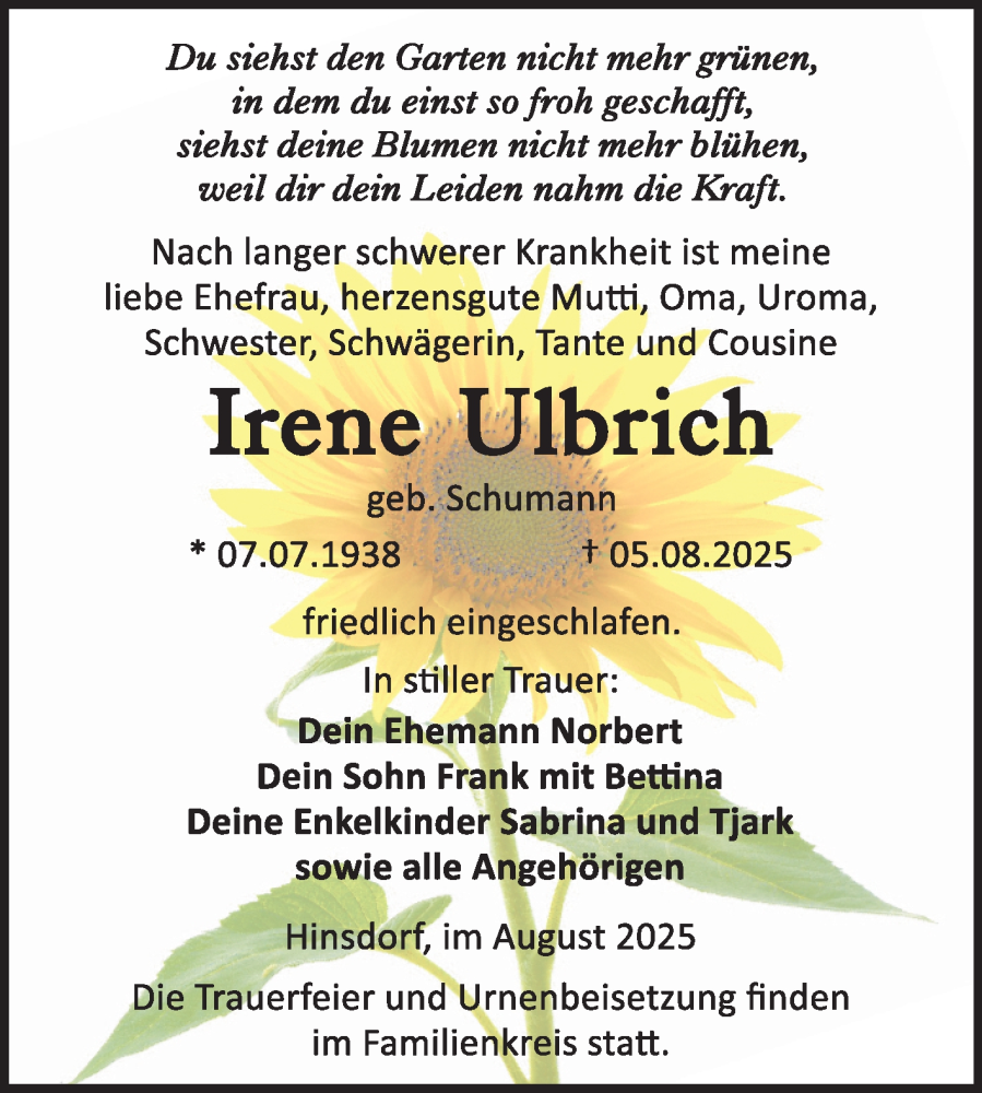 Hier finden Sie alle Traueranzeigen aus der Zeitung, die bisher für Irene Ulbrich erschienen sind. Weitere Traueranzeigen, die in der Zeitung erscheinen, werden hier ebenfalls aufgelistet