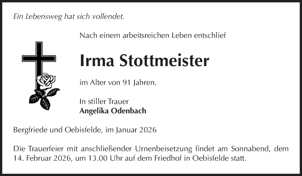 Hier finden Sie alle Traueranzeigen aus der Zeitung, die bisher für Irma Stottmeister erschienen sind. Weitere Traueranzeigen, die in der Zeitung erscheinen, werden hier ebenfalls aufgelistet