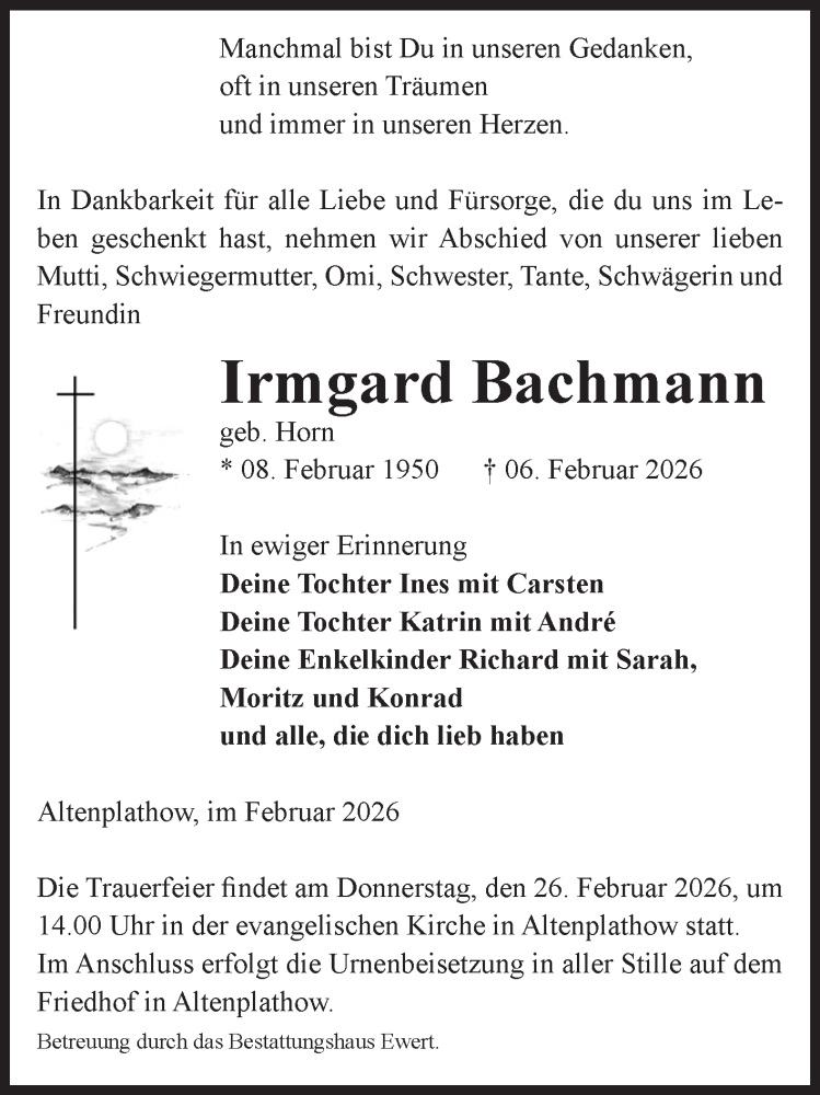 Hier finden Sie alle Traueranzeigen aus der Zeitung, die bisher für Irmgard Bachmann erschienen sind. Weitere Traueranzeigen, die in der Zeitung erscheinen, werden hier ebenfalls aufgelistet