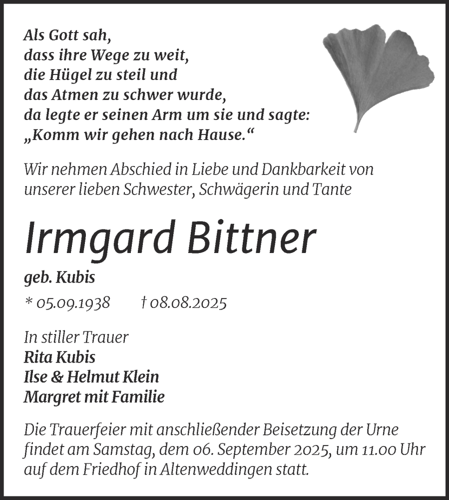 Hier finden Sie alle Traueranzeigen aus der Zeitung, die bisher für Irmgard Bittner erschienen sind. Weitere Traueranzeigen, die in der Zeitung erscheinen, werden hier ebenfalls aufgelistet