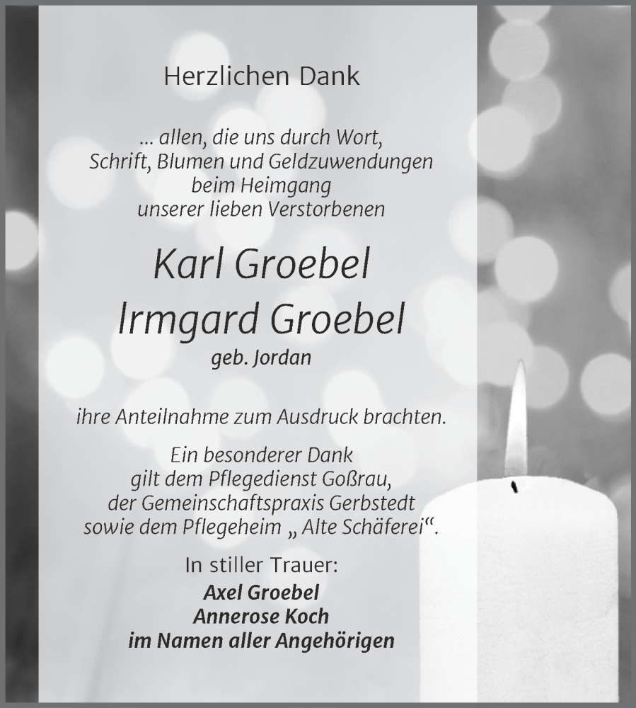 Hier finden Sie alle Traueranzeigen aus der Zeitung, die bisher für Irmgard Groebel erschienen sind. Weitere Traueranzeigen, die in der Zeitung erscheinen, werden hier ebenfalls aufgelistet