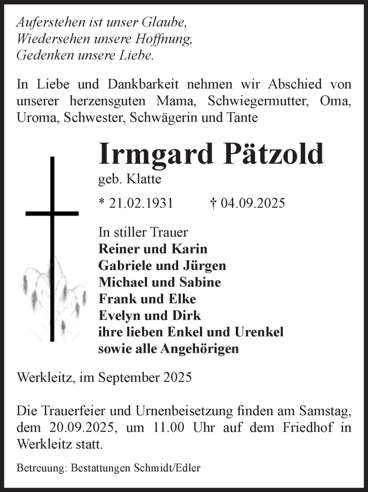 Hier finden Sie alle Traueranzeigen aus der Zeitung, die bisher für Irmgard Pätzold erschienen sind. Weitere Traueranzeigen, die in der Zeitung erscheinen, werden hier ebenfalls aufgelistet