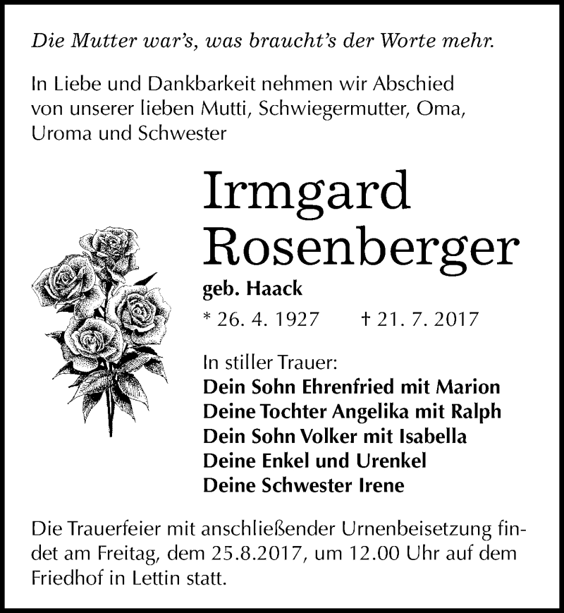 Hier finden Sie alle Traueranzeigen aus der Zeitung, die bisher für Irmgard Rosenberger erschienen sind. Weitere Traueranzeigen, die in der Zeitung erscheinen, werden hier ebenfalls aufgelistet