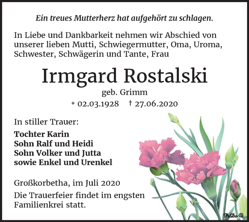 Hier finden Sie alle Traueranzeigen aus der Zeitung, die bisher für Irmgard Rostalski erschienen sind. Weitere Traueranzeigen, die in der Zeitung erscheinen, werden hier ebenfalls aufgelistet