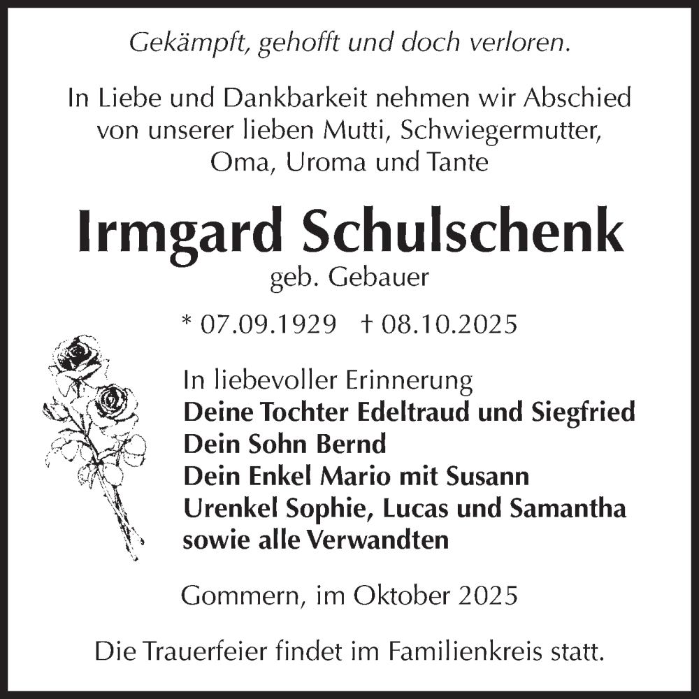 Hier finden Sie alle Traueranzeigen aus der Zeitung, die bisher für Irmgard Schulschenk erschienen sind. Weitere Traueranzeigen, die in der Zeitung erscheinen, werden hier ebenfalls aufgelistet